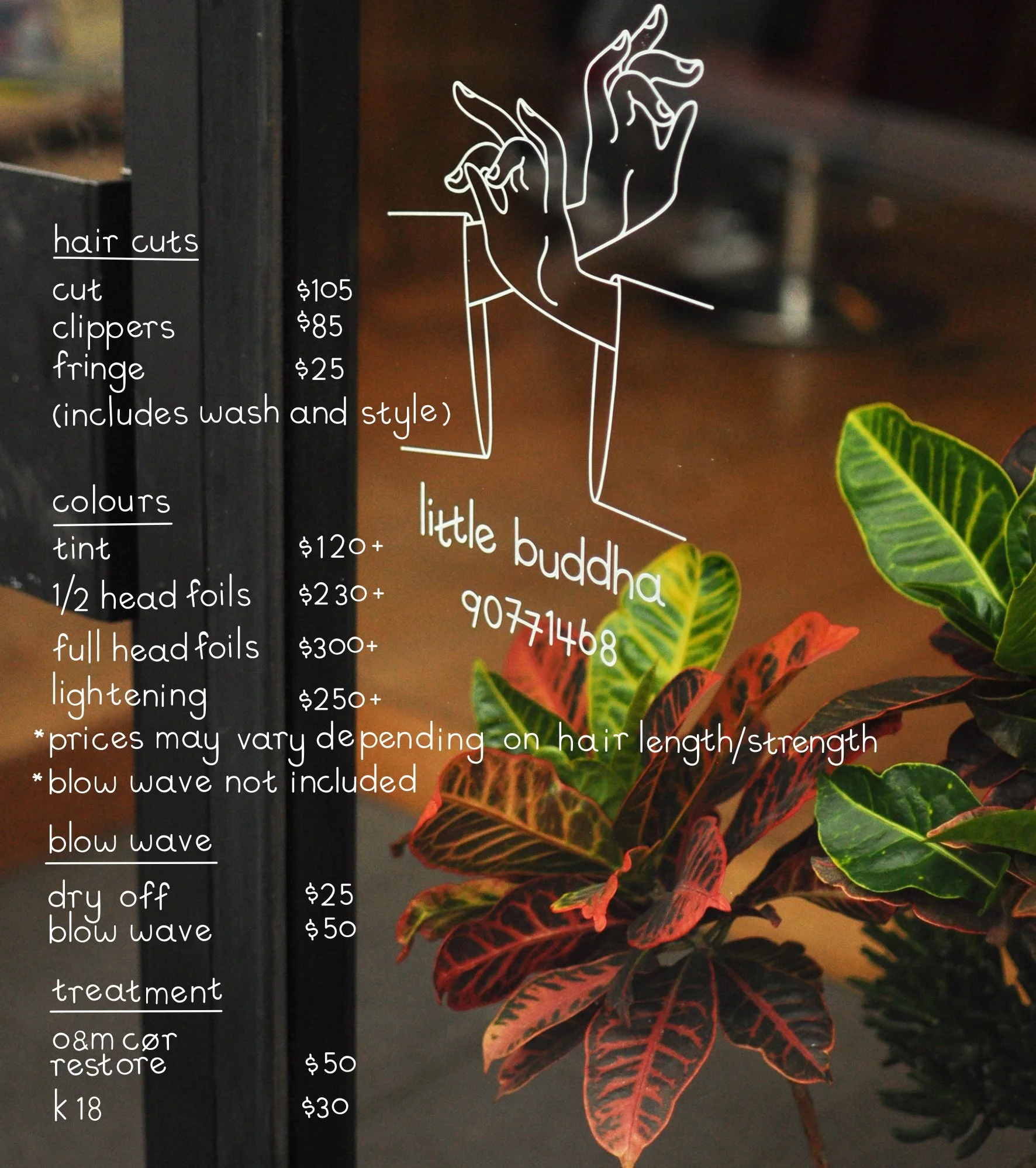 The price list for cuts, colour and treatments for Little Buddha hair salon